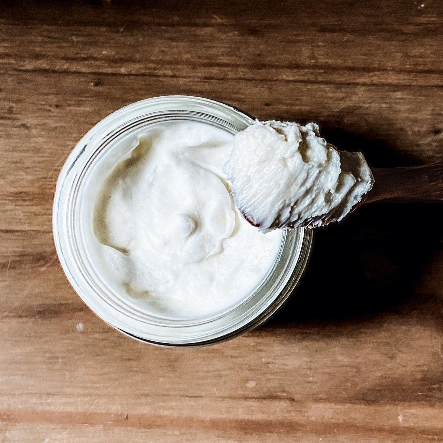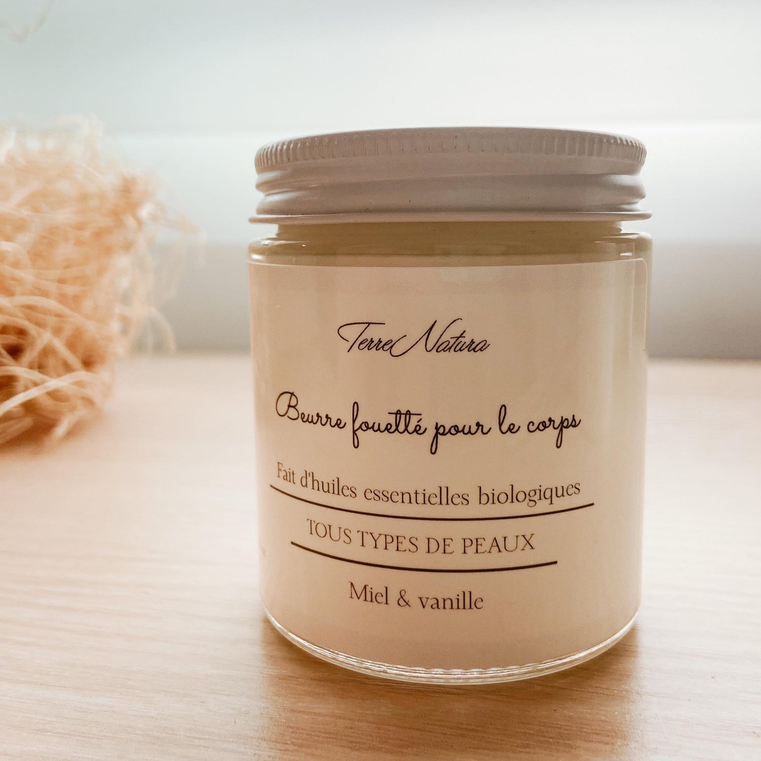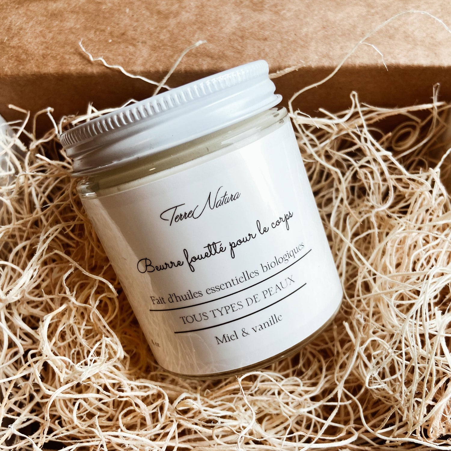 Beurre pour le corps miel vanille, 100% naturel, fouetté et onctueux, le tout dans un joli peau de verre réutilisable.