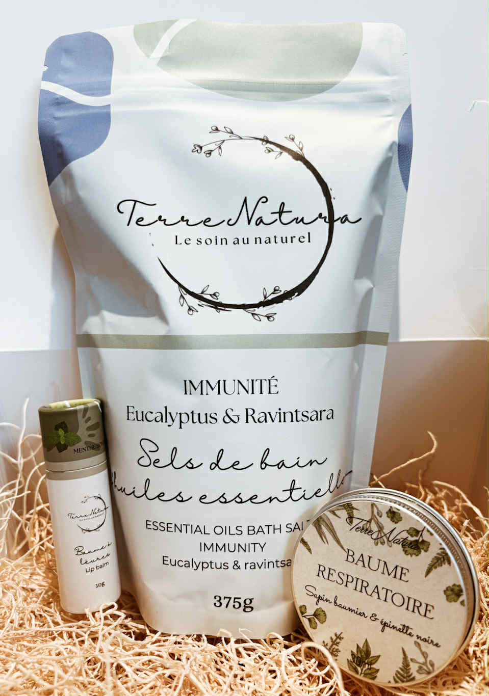 La boîte anti-rhume : Baume décongestionnant respiratoire sapin baumier et épinette noire, Sels de bain Immunité à l'eucalyptus & Ravintsara (375g) , Baume à lèvre Écologique Menthe poivrée & Romarin (10g)