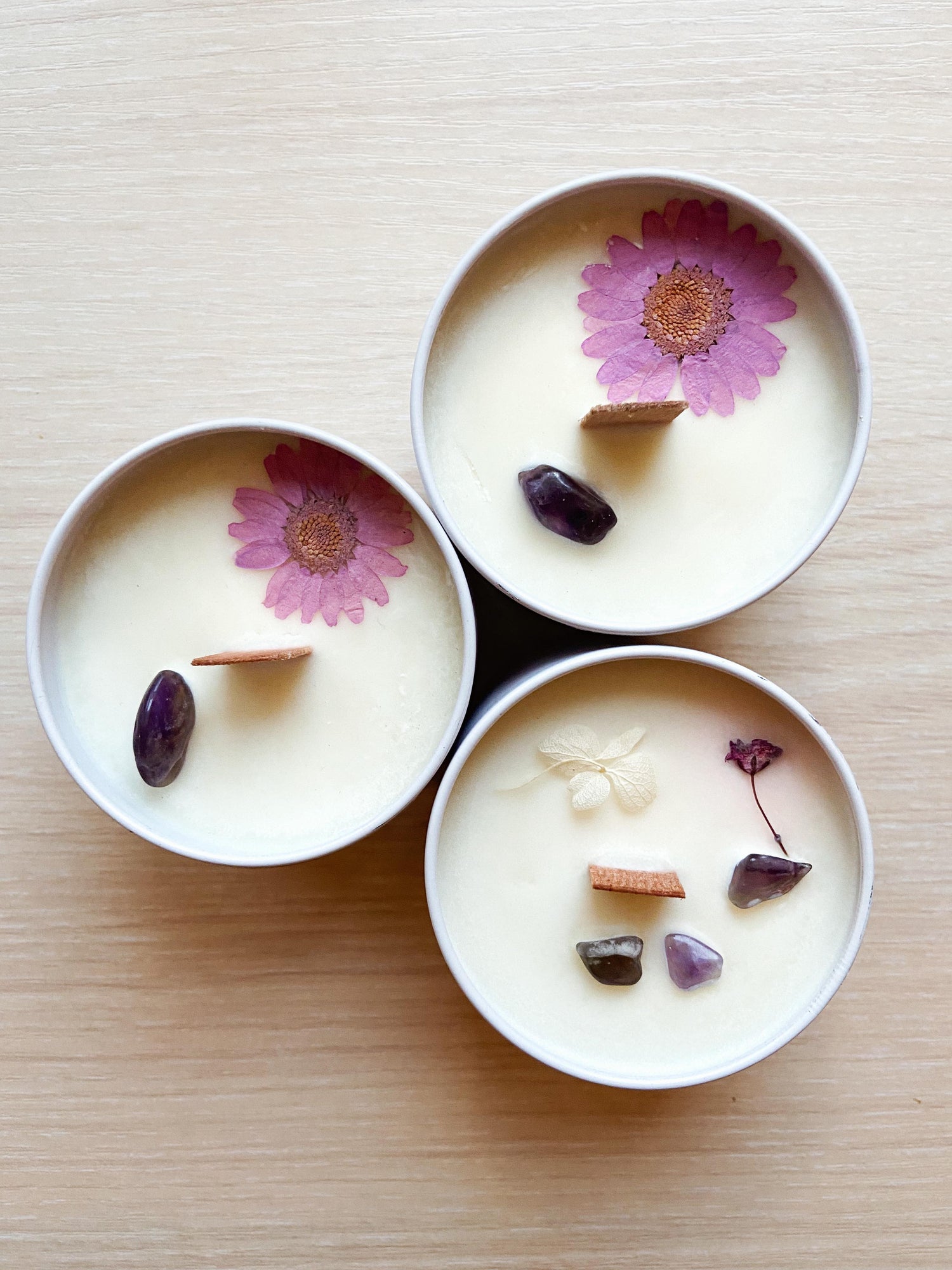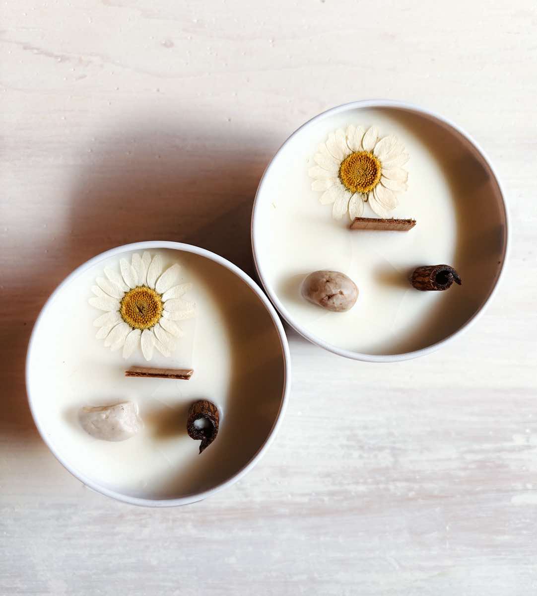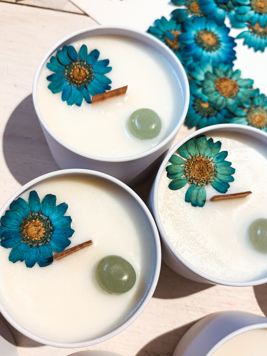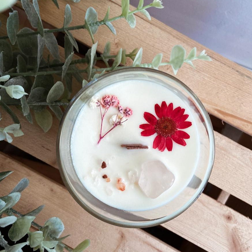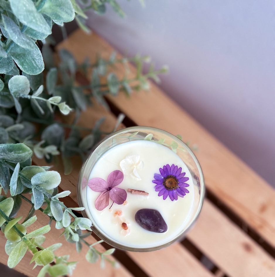 🕯️ Une bougie artisanale TerreNatura au choix : fabriquée à partir de cire de soja naturelle, parfumée aux huiles essentielles et fragrances naturelles, décorée de fleurs séchées et dotée d’une mèche de bois crépitante.